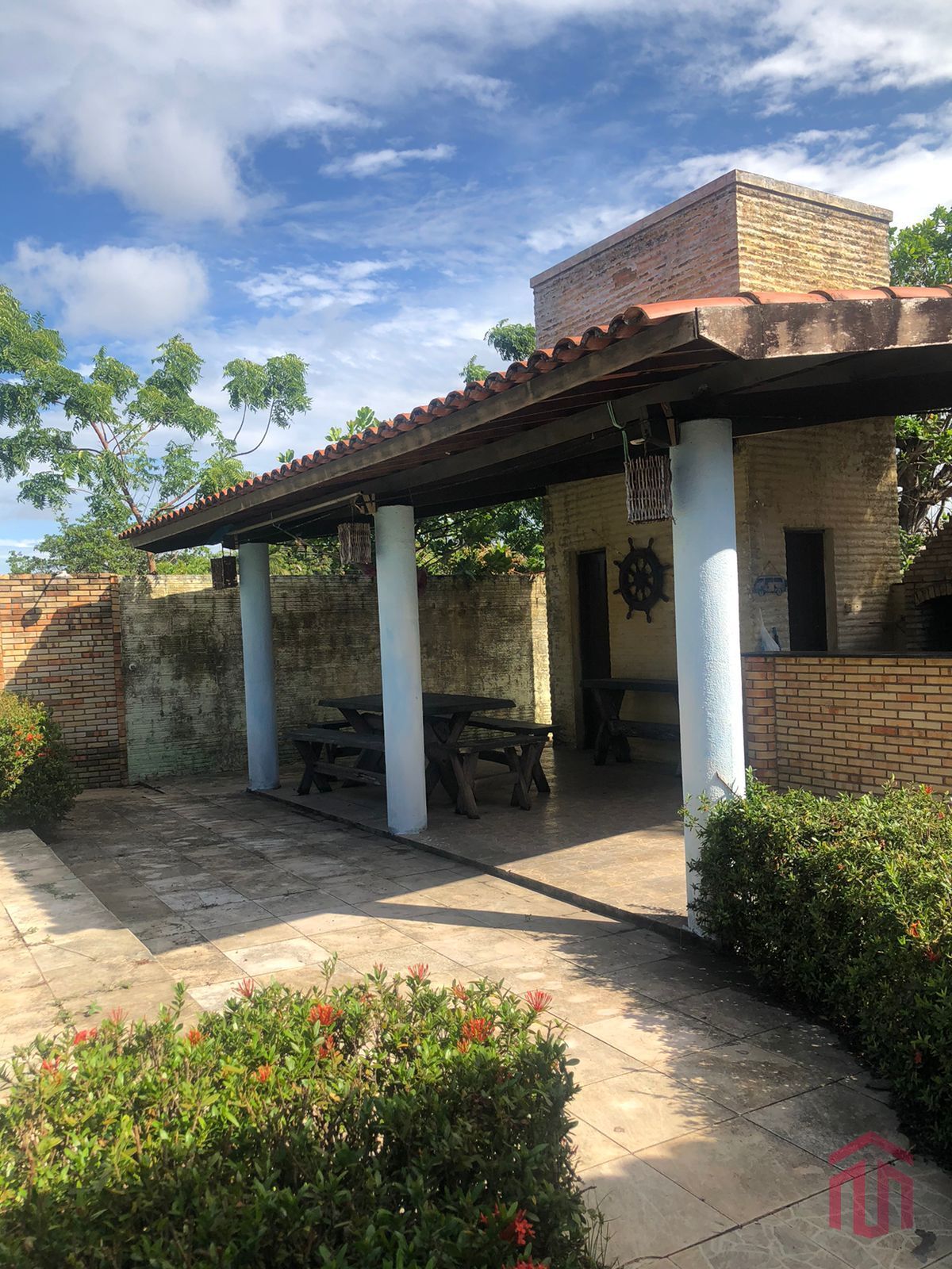 o imóvel possui uma garagem bem ampla, cozinha, sala de estar e área de serviço, piscina, deck